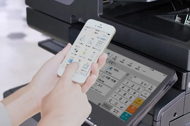 コピー、プリント、スキャンの設定を手元のスマートフォンから行うことができ、複合機本体の操作パネルに触れることなく作業を完了。